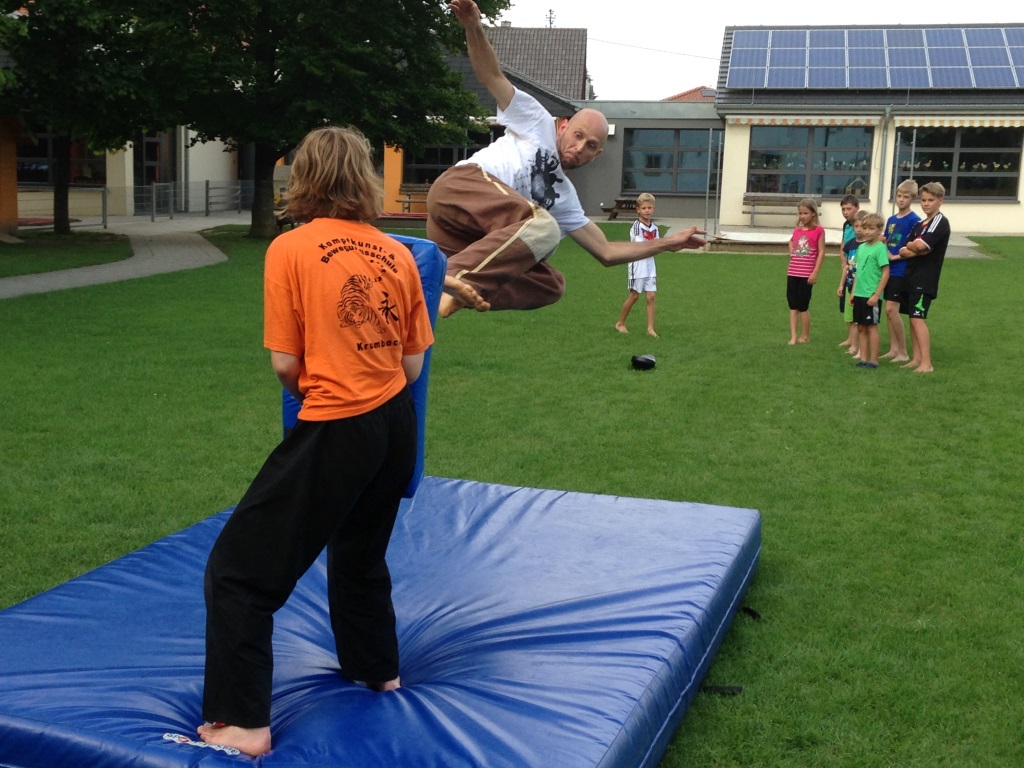 Die anwesenden Kids waren voll motiviert und es hat allen großen Spaß gemacht. Das Wetter war ja auch toll und die große Bodenmatte aus dem Pfarrheim erweiterte dann auch noch die Palette der durchgeführten Übungen. Das Programm dauerte von 3 bis halb 5.